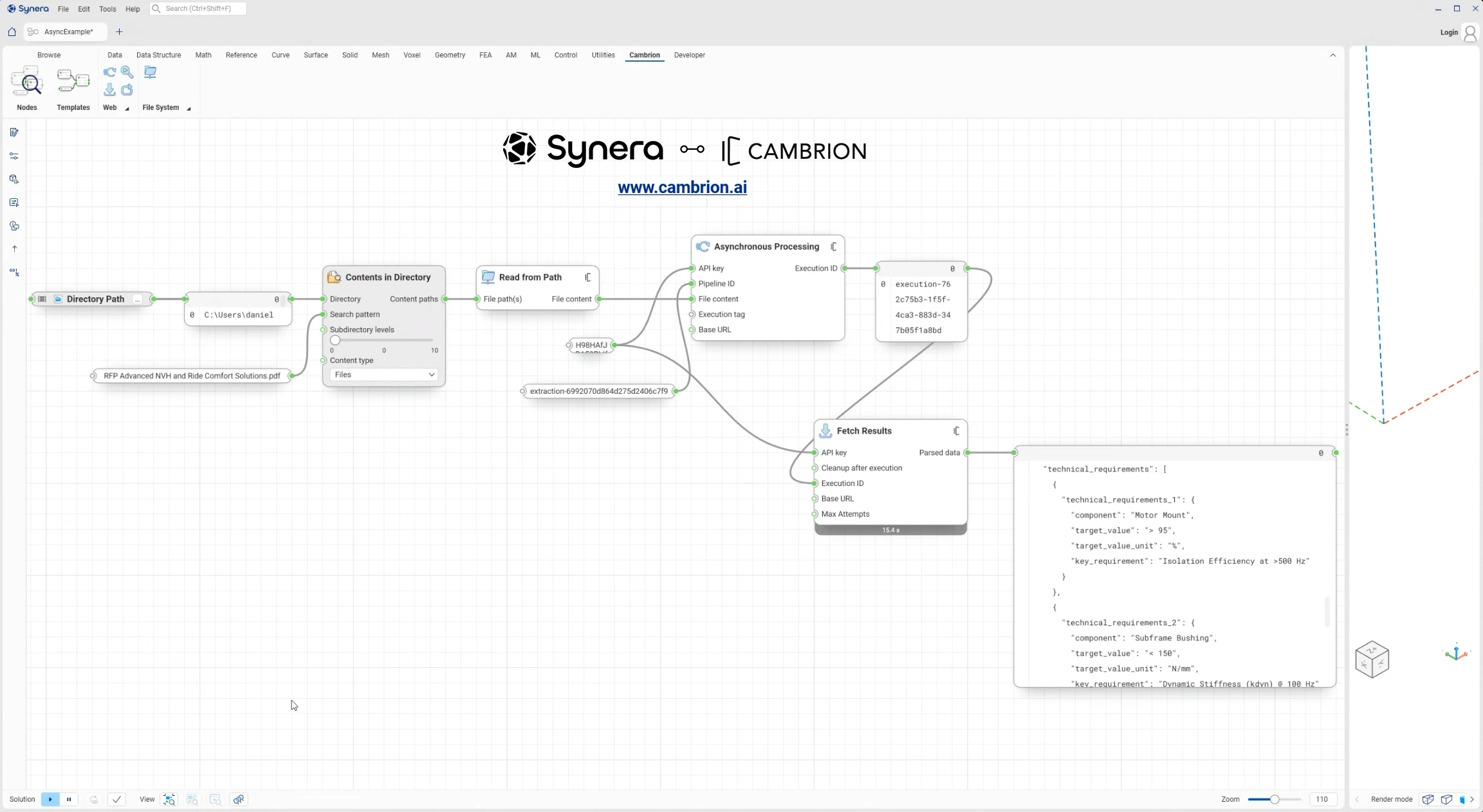 Mit diesem Add-in können Synera-Workflows nun Projekt- und Teilanforderungen direkt aus Ihren vorhandenen Dokumenten extrahieren, darunter PDF- und Word-Dateien. Anstatt RFQ-Pakete manuell zu scannen, senden Sie Dokumente an eine vorkonfigurierte Cambrion-Pipeline und erhalten strukturierte JSON-Daten zurück in Ihren Workflow.